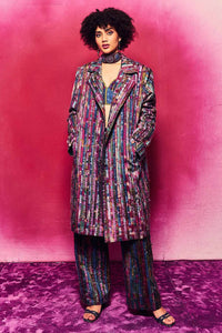 A sophisticated trench coat crafted with luxurious silk stripes and patchwork detailing throughout, offering a modern twist on a timeless silhouette. This elegant outerwear piece combines texture and pattern, making it a standout choice for both refined and edgy styles.