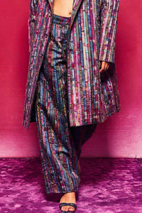 Long trouser pants adorned with all-over silk stripes in a striking patchwork design. These pants bring together elegance and artistry, adding a touch of luxury and bold pattern to any ensemble, perfect for a chic and polished look.