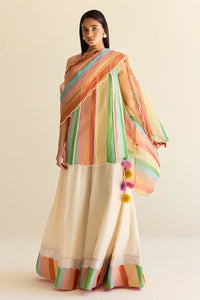 The Ayesha Kurti showcases handwoven Satranga silk tissue crafted in Banaras with seven vibrant silk hues and gold-plated zari. Featuring a flattering silhouette and pearl-embroidered neckline, it pairs beautifully with a Sharara in Kimkhwaab tanchoi tissue, melding traditional artistry with contemporary elegance for timeless festive wear.