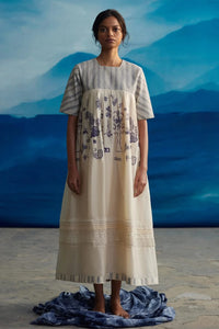 Presenting a fashionable and elegant dress showcasing a quilted yoke, imparting a distinctive and refined element to your collection. A laid-back and genuine garment, whether you're strolling through city streets or making a statement at the office with your artistic touch, this dress is a stunning piece worth cherishing. Embellished with hand-printed designs and lace accents to infuse a hint of daily allure, this enchanting design radiates an air of easygoing sophistication.