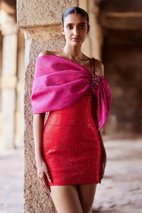 This pink and orange dress features off-shoulder bow-shaped sleeves and a lower panel in orange crystal fabric. It has an attached corset and is made from and melon crepe.