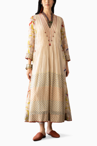 Handwoven Chanderi Pintucked Dress/Kurta With A Slip. Embellished With Hand Block Printed And Hand Done Beading.