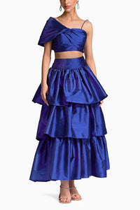 Make a bold statement with the Azura set, featuring a vibrant one-shoulder crop top with knotted detailing and a voluminous tiered taffeta skirt. This striking ensemble blends elegance with playful sophistication.