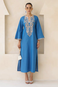 Azura Kaftan with rich metallic thread work in the front of the kaftan or sleeves.
