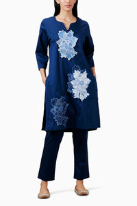 This elegant ensemble features a relaxed-fit top with beautifully hand-crafted appliqué flowers in a gradient of blue tones, creating a striking 3D effect. The top has full sleeves, a side slit, and a touch of sophistication. Paired with sleek, ankle-length pants designed with a straight fit, elasticized waistband, and functional side pockets, this set offers both comfort and modern style.