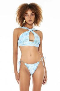 Radiate elegance in the Azure Halter Neck Wrap Top, featuring gold chain details and a secure back tie fastening. Paired with a triangle bikini bottom adorned with gathering, gold chain embellishments, and gold tassels at the tie cords, this set offers a perfect blend of glamour and style.