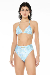 Glow in the Azure Triangle Bikini Set, featuring a triangle top with gathering detail, gold chain embellishments, and gold tassels at the tie cords. The high-waisted bottoms complement the look with a gathered waistband and matching gold chain accents for a chic, polished finish.