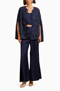 This enchanting ensemble features an intricate cape crafted from embellished lace fabric, showcasing delicate patterns and a subtle shimmer, making it perfect for the festive season. It is paired with a satin bustier with a flattering sweetheart neckline, adding a touch of elegance. The look is completed with bell-bottom pants, offering a chic and dramatic silhouette that enhances the overall style.