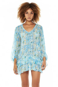 Add a playful touch to your beach look with the Azure Ruffle Trim Short Dress. This printed short-length dress features delicate ruffle detailing and is embellished with faceted stones at the tie cords for a hint of sparkle and charm.