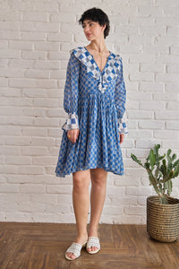 A playful twist on vintage charm, this sailor-collar dress is crafted in lightweight cotton for an airy, comfortable fit. Featuring a bold harlequin check collar paired with a delicate geometric print body, it blends contrast and harmony beautifully. The relaxed silhouette with gathered pleats offers movement and ease, while statement cuffs add a touch of sophistication. Perfect for an effortless day look or a statement summer outing.