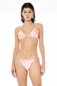 The Azure Halter Neck Wrap Top features elegant gathering and gold chain embellishments, finished with gold tassels at the back tie. Paired with a matching triangle bikini bottom that also showcases gathering, gold chain details, and tassels at the tie cords, this set combines chic style with luxurious accents.