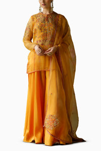 Featuring Baani Sharara Set by Shikha Mehta from their Kala Collection. This delightful ensemble showcases a turmeric yellow silk organza top, intricately embroidered for a radiant finish. Paired with a matching silk chanderi blouse and sharara, it’s complemented by an elegant embroidered silk organza dupatta. Perfect for festive occasions, this set exudes charm and sophistication, making it a must-have for your wardrobe.