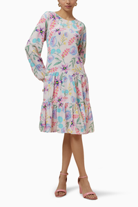 The baby pink lavender dream print crepe frill hem tunic is a charming piece that combines softness and style. Crafted from smooth, airy crepe, this tunic showcases a delicate print in gentle hues of baby pink and lavender, adding a dreamy, feminine touch. The frill hem adds a playful, elegant detail, creating a flowing silhouette that moves beautifully with you.Â
