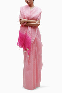 This Bandhani on pure Organza saree in baby pink with a rani dip dyed pallu. The saree comes with a pure silk blouse piece in rani.