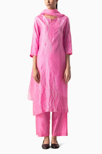 Bandhani takes a modern wave like shape on this baby pink silk kurta. The design comes interspaced with hand done mirror work. The kurta comes clubbed with organza stole and silk pants.
