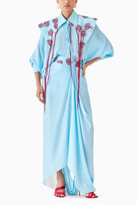 The Baby Tulip Batwing Shirt & Skirt co-ord crafted from our stunning Vegan Silk & crepe fabrication, trans-seasonal, is a statement piece. The shirt, made in our hand dyed crepe has a wide collar with contrast beads. It has a batwing fit. The draped skirt in vegan silk, hand embroidered with thread, has a side zipper and a knot.; It is paired with our matching detachable baby tulip collar with embroidery and thread. Wear it with heels for an elegant look.