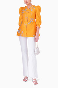 Brighten your wardrobe with the Bahama Sunset Orange Embroidered Cotton Top, paired with Pearl Denim White Flared Pants. This vibrant orange top features beautiful front embroidery and stylish snap buttons, complemented by 3/4th puffy sleeves and stitch line details for a chic touch. With a relaxed fit for ultimate comfort, it pairs perfectly with the full-length flared pants made from stretchable denim. These pants include a back elasticated waistband and convenient side pockets, making this ensemble both fashionable and functional for any occasion.