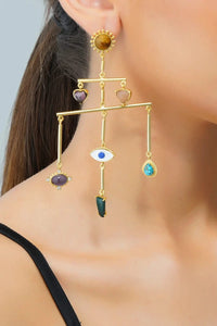 These 22kt gold plated pair of stylish statement earrings are studded with 7 semi-precious rainbow gemstones to represent and support the alignment of the chakras. These offbeat earrings have the power to dress you up in an instant. Pair them with your coord sets,crop tops, shift dresses, printed sarees or use it as a transitional piece to take you from work to party.