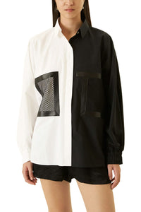 Featuring a striking half black/white design, this pure cotton shirt blends bold contrast with unique texture. Accented with mesh and leather detailing, it offers a contemporary edge in a comfortable, free-size fit.