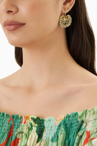 With an intricate design these leaf earrings made in brass in gold plating and enamel. The hints of black and grey elevates the design of this piece.