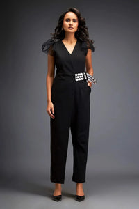 Featuring tailored jumpsuit with delicate sheer shoulder accents and statement belt.