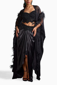 Featuring Balk Baheera Embellished Coord Set in V.Ggt, Lycra Satin, Net. Hand Embellished in Black hues. Blouse is crafted with beads. Paired with complementing drape skirt with waist band. Styled with feather cape.