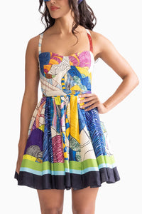 Featuring Ballerina Multi Dress by Saaksha & Kinni from Botanica Collection. A tribal print flared mini dress showcasing a detachable belt, offering a playful silhouette with customizable waist definition for versatile styling.