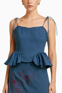 his structured yet soft peplum top is made from breathable banana cotton in a washed denim tone. A sculptural take on femininity, the top features a fitted bodice with princess seams and adjustable shoulder ties. The highlight is a circular cut-out at the waist, where a gathered circular panel is attached to create dramatic flare and volume — forming a seamless, organic peplum silhouette. Finished with a clean back zipper, it's a versatile piece that pairs effortlessly with both skirts and trousers.