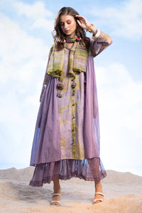 Elegant Band Collar Front-Open Eco Print and Tie-Dye Flare Tunic Dress in Lavender, paired with a long jute frill inner and a tie-dye stole. Crafted from soft cotton, this set combines vibrant hues of Lavender, Ecru, Powder Pink, and Ivory, offering a stylish, feminine look with intricate detailing and a flowy silhouette.