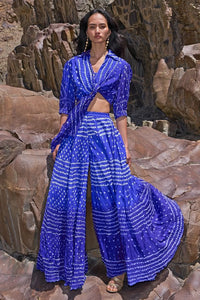 Crop shirt in tonal blue with placement bandhani and ombré detailing. Band collar with a concealed placket and self-tie knot detail at the front. Three-fourth bishop sleeves with elasticated cuffs. Lined at the front and back. Paired with matching flared and flowy pant. Wide-legged with lots of movement. Fully elasticated waist for comfort. Pant is fully lined. Made in natural, breathable viscose. Each piece is unique in colour and pattern as the bandhani tie & dye is a hand-done process.