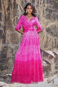 Fuchsia crop shirt with self-tie knot detail at the front. Placement bandhani with ombré detailing. Shirt collar and full sleeves with buttoned cuffs. Subtle ruching at the front and gathered detailing at the sleeve. Comes with a matching slip. Each piece is unique in colour and pattern as the bandhani tie & dye is a hand-done process. Paired with matching A-line skirt. Skirt has fully elasticated waist for a comfortable fit. Flowy with lots of movement. Skirt is fully lined. Made in natural, breathable viscose. Each piece is unique in colour and pattern as the bandhani tie & dye is a hand-done process.
