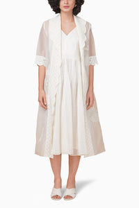 Featuring a Bara embroidery jacket in silk organza and solid overlap dress in stripe organza.