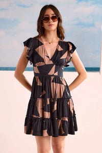 Effortlessly chic and breezy, the tiered Barcelona Ruffle Dress features a bold abstract print in earthy tones, complemented by delicate ruffle sleeves and a flattering V-neckline. The lightweight fabric and flowy silhouette make it perfect for warm-weather outings, from beachside strolls to brunch with friends. Pair it with strappy sandals, oversized sunglasses, and a woven crossbody bag for a relaxed yet polished vacation look.