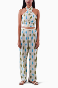 Unveiling the Susegad Barefoot Dreams Co-Ord Set (Top & Pants), where vibrant patterns burst to life in delightful shades of green and blue, channeling the enchanting rhythm of nature. Perfect for brunches and summer outings, this comfy outfit offers unmatched fluidity, allowing you to move with ease. Featuring an elasticized waist, a charming back tie-up, a flattering halter neck design, and unique ikat patterns, this set is a stylish and effortless choice for any warm-weather occasion. Embrace your carefree spirit in this stunning ensemble!