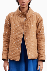 A fawn beige mul quilted jacket with stand up collar, two front pockets, full sleeves and blue & off white chequered lining.