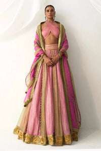 Featuring Basanti Gulabi Pink & Olive Lehenga Set by ITRH's Sona Chandi Collection, this Set features a halter blouse intricately finished with ghunghroo details, paired with a vertical color-blocked lehenga with a dot-embellished border. It is complemented by a stunning organza double-tone dupatta, adding depth and elegance.
