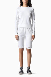 Featuring Base O.1 and Shorts Set, Tee cut in a ribbed lycra features a long sleeved fitted tee with an interesting teardrop shaped cut out at the back. It is further enchanced with stringed beads hand embroidered on the side seams. Paired it with the Ribbed Shorts features a high waist and elasticated waistband cut in a ribbed stretch lycra. Enhanced with hand embroidered beads along the side seam and hem.