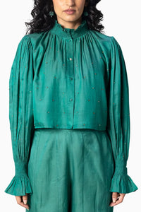 Basil Blouse, a rich green silk cotton satin blouse adored with scattered sequins and beads in soft natural and vibrant orange hues, featuring a high neckline with a soft ruffle.