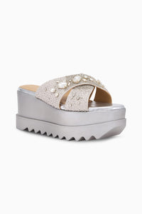 Our Be My Hero wedge sandals are crafted in silver gajji fabric and embellished with cutdana and zardozi embroidery. Each shoe is decorated with plump, lustrous stones that complement its silver tones. Match these wedge sandals with a stylish ensemble and make a majestic entry arm-in-arm with your dashing hero. A little open-toe tease hurt nobody, especially when the wedge heel is so comfortable and supportive. The artisans of Anaar take 20 hours to carefully construct this pair.