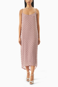 Featuring the Bea Powder Mauve Dress from Kangana Trehan's Rush Hour 18:45 Collection. This midi sensation showcases spaghetti straps, hand-embellished georgette, and a relaxed fit. With its soft elegance and subtle shimmer, it's the perfect choice for any occasion.
