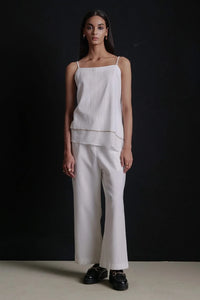 This exquisite white co-ord set redefines modern luxury with its sleek camisole and impeccably tailored wide-leg trousers. Crafted from premium handwoven fabric, it embodies timeless sophistication and sustainable elegance. A perfect choice for the discerning wardrobe.