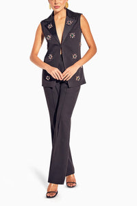 Featuring a stone and bead worked jacket with lapels and front hooks, paired with bootleg pants.