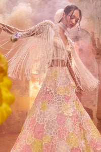 Featuring a draped fringe top crafted from a delicate tulle base, this piece is adorned with cascading fringes that create a dynamic and textured look. The draped design allows the fringes to move gracefully with every motion, adding a sense of fluidity and movement. The tulle fabric provides an ethereal backdrop, enhancing the overall elegance and sophistication of the top. This combination of draped styling and playful fringes makes it a standout choice for a chic and stylish ensemble.