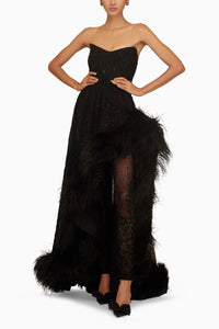 This stunning tulle slit gown with feathers and beaded hand embroidery is the ideal evening look.