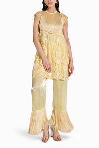 Featuring a workednet tunic top with fringes, spaghetti lining top. Paired with straight elasticated pants with fringes at hem.