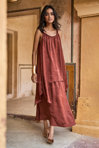 Sleeveless top with an asymmetric hem and a relaxed, flowing silhouette. Made in a rich textured tonal jacquard. Braided beaded strap detailing along the neckline. Lightweight and elegant, perfect for layering or pairing with matching separates.