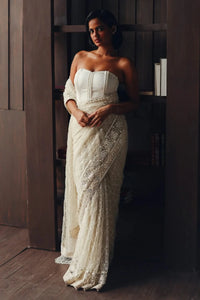A classic saree adorned with intricate beadwork jaal and embelished borders, further elevated by delicate mirror accents. Long beaded tassles on the pallu, paired with a beautifully structured corset blouse, fitted with delicate beaded laces and finished with resham tassel-tipped strings, this ensemble blends timeless artistry with mordern sophistication.