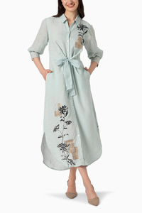Our love for flowers blooms on luxurious linen with glorious handcrafted linear floral thread embroidery bordering thick and thin waves of its likeness; layered on a bed of beaten-up zardosi; hand-embroidered to bejewel the fabric for a touch of opulence and depth.