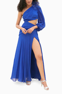 Beautiful Chaos is one shoulder Asymmetrical Dress that features a voluminous sleeve and is artistically hand ruched on the top with elegant cut-out detail at the waist and a pleated skirt with a high thigh cut on the skirt bodice. The shoulder is adorned with a beautifully hand-embroidered 3D flower. The dress is ruched and fitted till the hips and floats to the floor giving a look to the entire dress. While a high side slit shows a glimpse of the leg only.