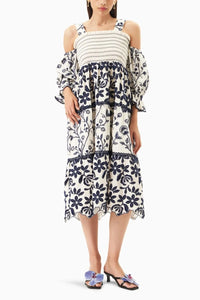 Summer lunches a nd summer soirées just got gla morous with Miri's Becca dress. The gorgeously cra fted dress is ma de in light weight fine cotton in a mix of different textured flora l embroidery. The smocked bodice , squa re neckline deta iling a nd pin tucks on the sleeves with fine delica te la ce crea te a very roma ntic, drea my summer dress - tha t ma kes the Miri's girl the show stopper !